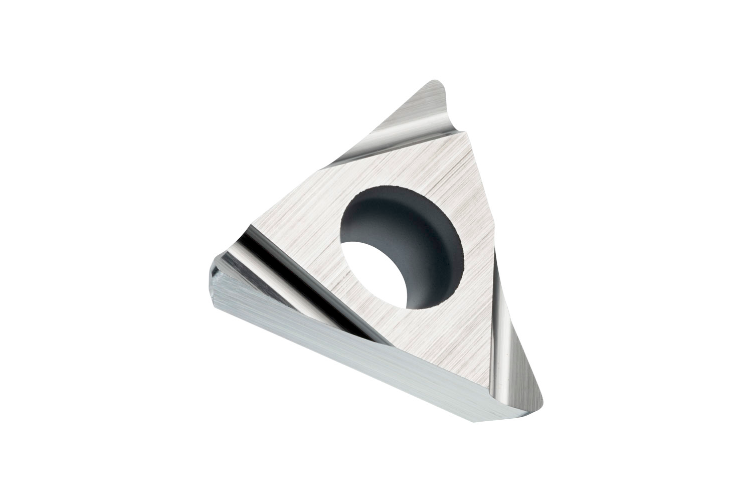 Special design positive turning insert, triangular with 11° clearance, inscribed circle diameter of 6.35mm, 2.38mm thick, 0.4mm nose radius, indexing accuracy according to ISO-tolerance class-G, chip-breaker JQ with sharp cutting edges, in grade TT010, an uncoated cermet within ISO range P01 -P10, for fine machining of steels with a right handed turning tool