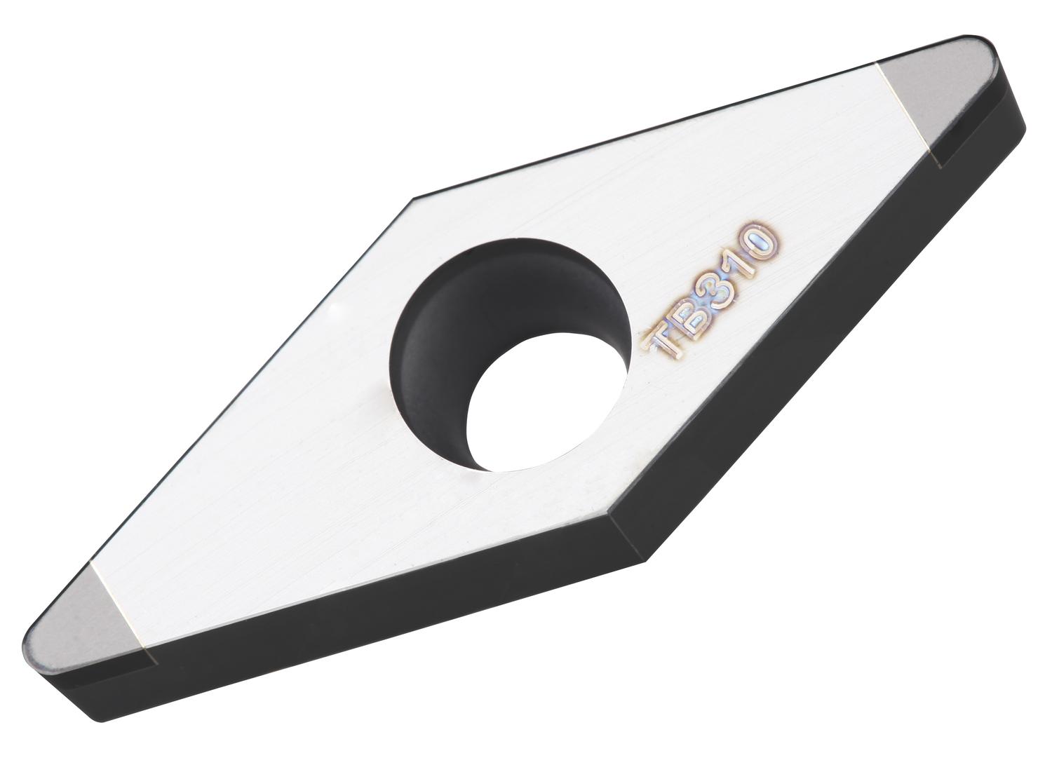 Insert for hard turning with 2 CBN tipped corners on one-side, 35° rhomboid with 5° clearance, inscribed circle diameter of 9.525mm, 4.76mm thick, 0.8mm nose radius, indexing accuracy according to ISO-tolerance class-G, rounded cutting edges with facet T-land -20°/0.1mm, in grade TB310, an uncoated cubic boron nitride within ISO range H01 -H10, for high-speed machining of hardened materials