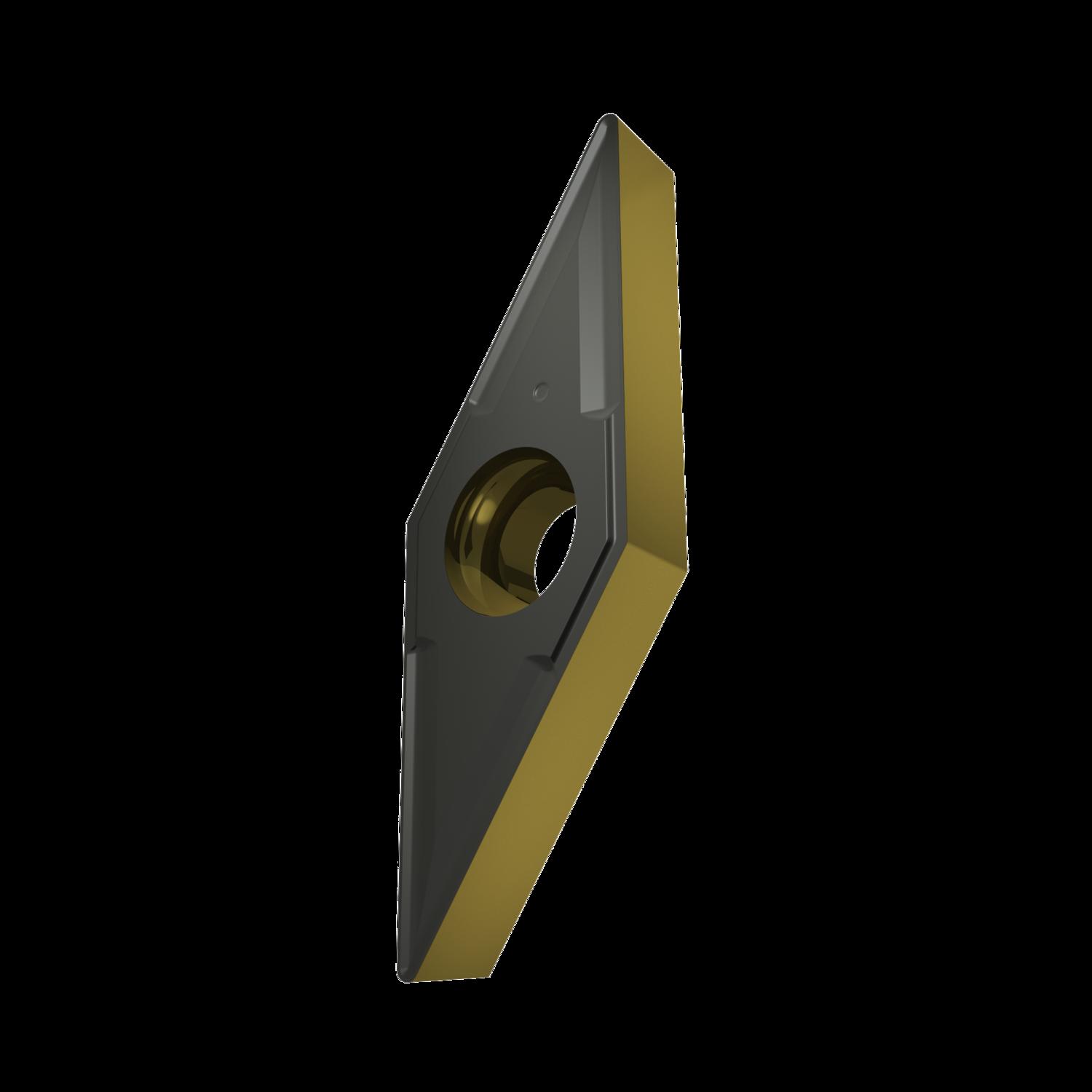 Single-sided positive turning insert, 35° rhomboid with 7° clearance, inscribed circle diameter of 7.94mm, 3.18mm thick, 0.4mm nose radius, indexing accuracy according to ISO-tolerance class-G, chip-breaker NF2 with rounded cutting edges, in grade T9415, a MT-CVD coated functionally graded WC-Co carbide, for fine to medium machining