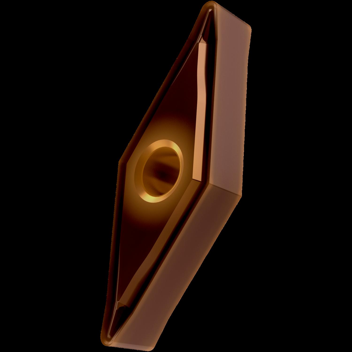 Double-sided negative turning insert, 35° rhomboid with inscribed circle diameter of 9.525mm, 4.76mm thick, 0.8mm nose radius, indexing accuracy according to ISO-tolerance class-M, chip-breaker NF with rounded cutting edges, in grade T9315, a MT-CVD coated functionally graded WC-Co carbide within ISO range P05 -P25, for fine to medium machining of steels
