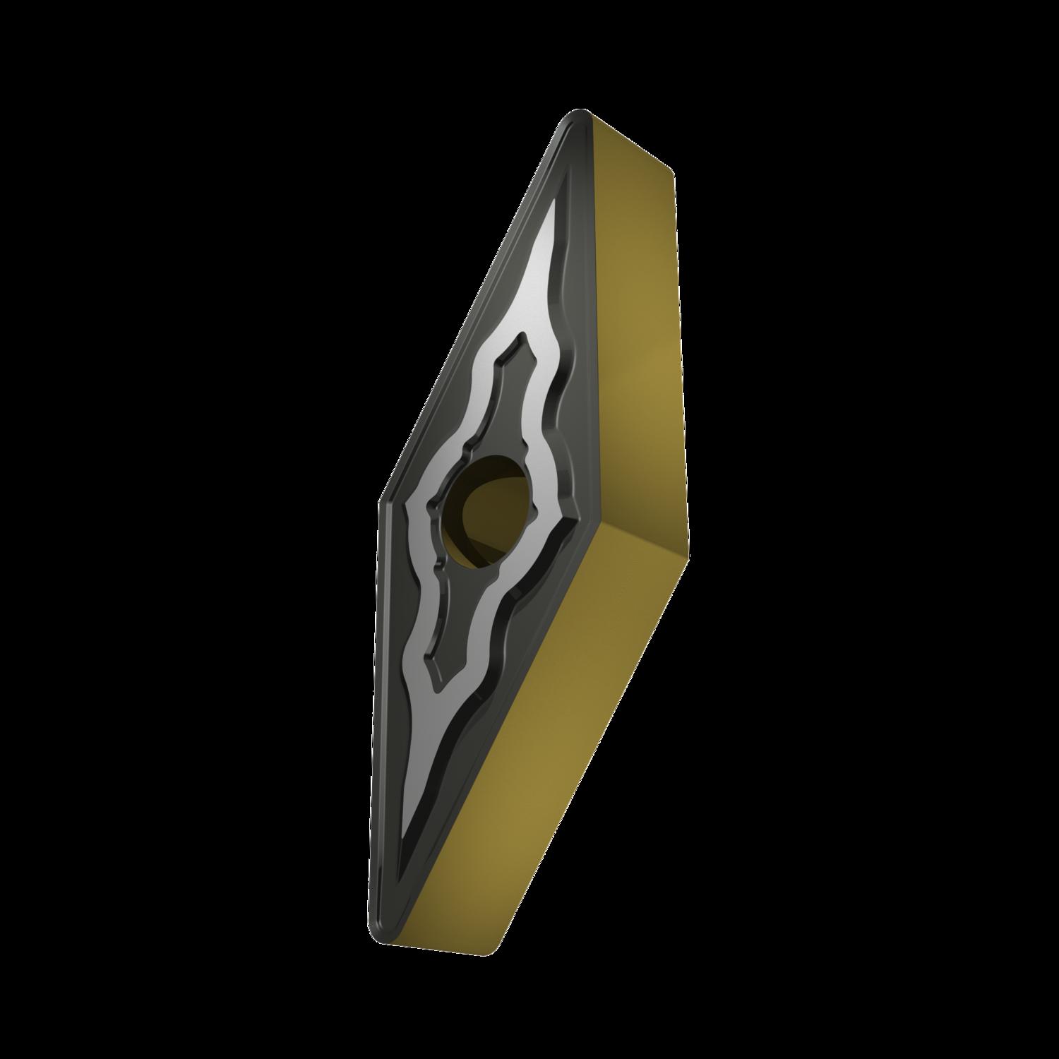 Double-sided negative turning insert, 35° rhomboid with inscribed circle diameter of 9.525mm, 4.76mm thick, 0.8mm nose radius, indexing accuracy according to ISO-tolerance class-M, chip-breaker NMR with rounded cutting edges, in grade T9415, a MT-CVD coated functionally graded WC-Co carbide within ISO range P05 -P30, for fine to heavy machining of steels