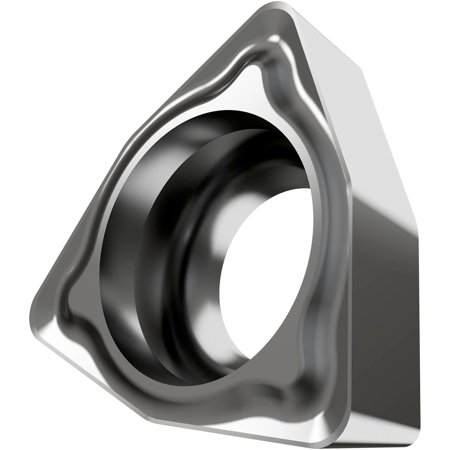Single-sided positive turning insert, 80° trigon with 7° clearance, inscribed circle diameter of 3.97mm, 1.59mm thick, 0.4mm nose radius, indexing accuracy according to ISO-tolerance class-G, chip-breaker FF2 with rounded cutting edges, in grade HF7, an uncoated fine grained WC-Co carbide within ISO range K10 -K25, for fine to medium machining of cast-irons
