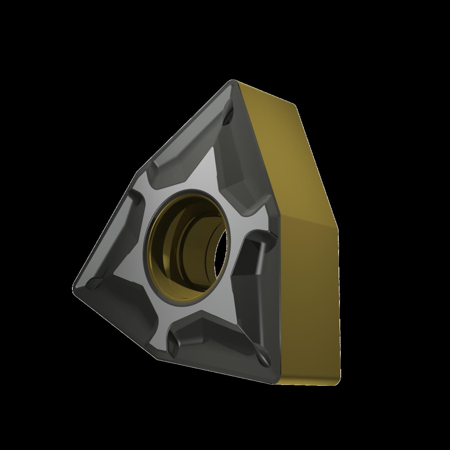 Double-sided negative turning insert, 80° trigon with inscribed circle diameter of 9.525mm, 4.76mm thick, 0.4mm nose radius, indexing accuracy according to ISO-tolerance class-M, chip-breaker M with rounded cutting edges, in grade T9415, a MT-CVD coated functionally graded WC-Co carbide within ISO range P05 -P30, for fine to heavy machining of steels