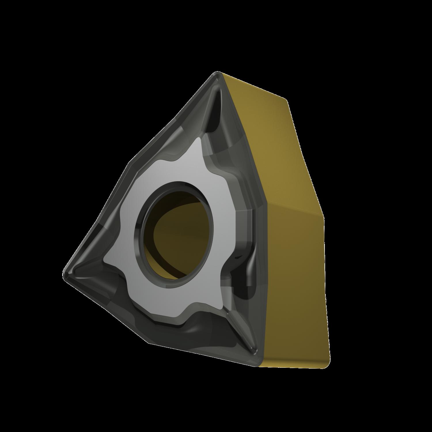 Double-sided negative turning insert, 80° trigon with inscribed circle diameter of 9.525mm, 4.76mm thick, 0.4mm nose radius, indexing accuracy according to ISO-tolerance class-M, chip-breaker NF with rounded cutting edges, in grade T9415, a MT-CVD coated functionally graded WC-Co carbide within ISO range P05 -P30, for fine to medium machining of steels
