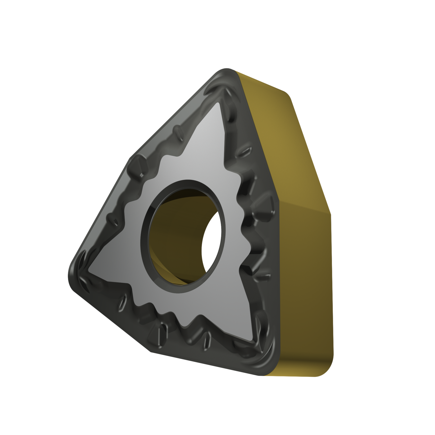 Double-sided negative turning insert, 80° trigon with inscribed circle diameter of 12.7mm, 4.76mm thick, 1.2mm nose radius, indexing accuracy according to ISO-tolerance class-M, chip-breaker FM with rounded cutting edges, in grade T9415, a MT-CVD coated functionally graded WC-Co carbide within ISO range P05 -P30, for fine to medium machining of steels