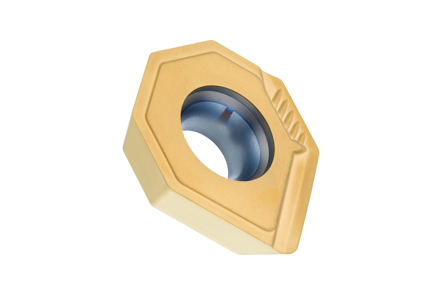 Single-sided milling insert XEHT 0604 with chip-breakers, special shape and wiper design for a maximum depth of cut of 3.3mm, with an indexing accuracy according to ISO-tolerance class-H with rounded cutting edges and facet, M8330 PVD coated fine grained WC-Co carbide within ISO-grade range P20 -P40 for machining of steel with face mills SOE06Z