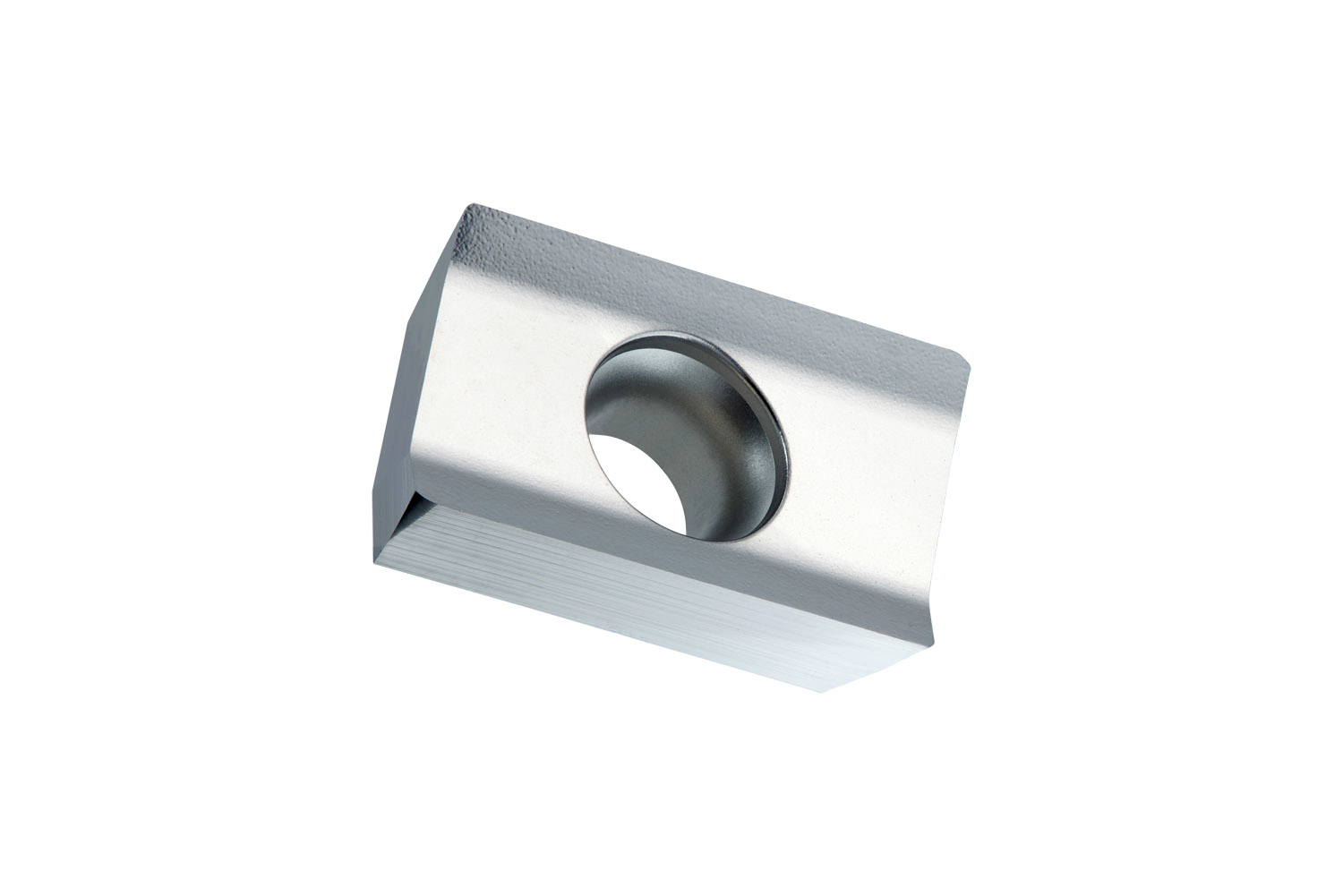 Single-sided milling insert XPHT 1604 with chip-breakers, special shape for a maximum depth of cut of 15.0mm, with 0.8mm corner radius, an indexing accuracy according to ISO-tolerance class-H and FA geometry with sharp cutting edges, HF7 uncoated fine grained WC-Co carbide within ISO-grade range N10 -N25 for machining of non-ferrous metal