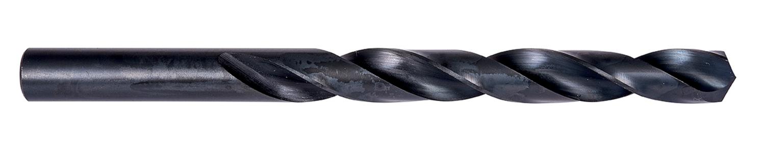 Aircraft extension-length drill with straight shank, diameter 0.1563″ (5/32) with an overall length of 6″ and flute length of 2″ according to NAS907 Type B standard with 135° heavy duty split point, HSS with steam tempered finish for 4xD drilling without pecking in steel, stainless steel and cast iron