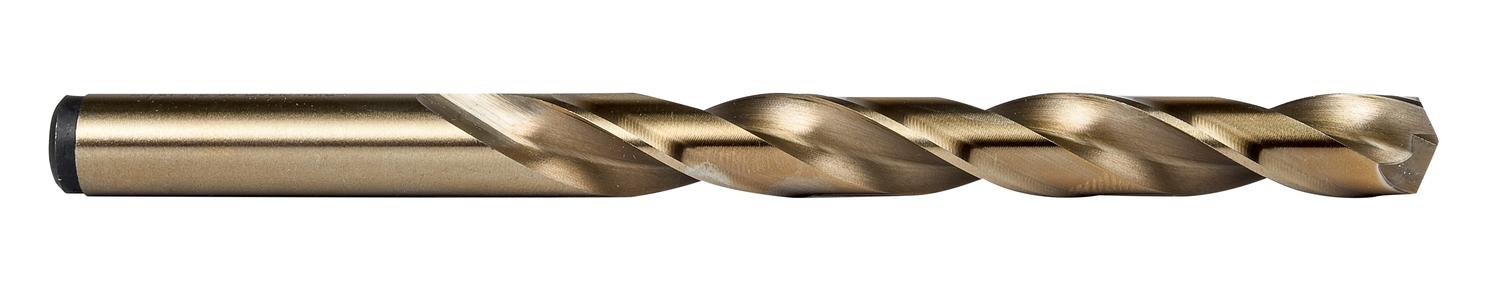 Jobber length drill with straight shank, diameter 0.4375″ (7/16) with an overall length of 5.1/2″ and flute length of 4.1/16″ according to NAS907 Type J standard with 135° heavy duty split point, cobalt based HSS-E with bronze finish for 4xD drilling without pecking in steel, stainless steel, cast iron and super-alloy