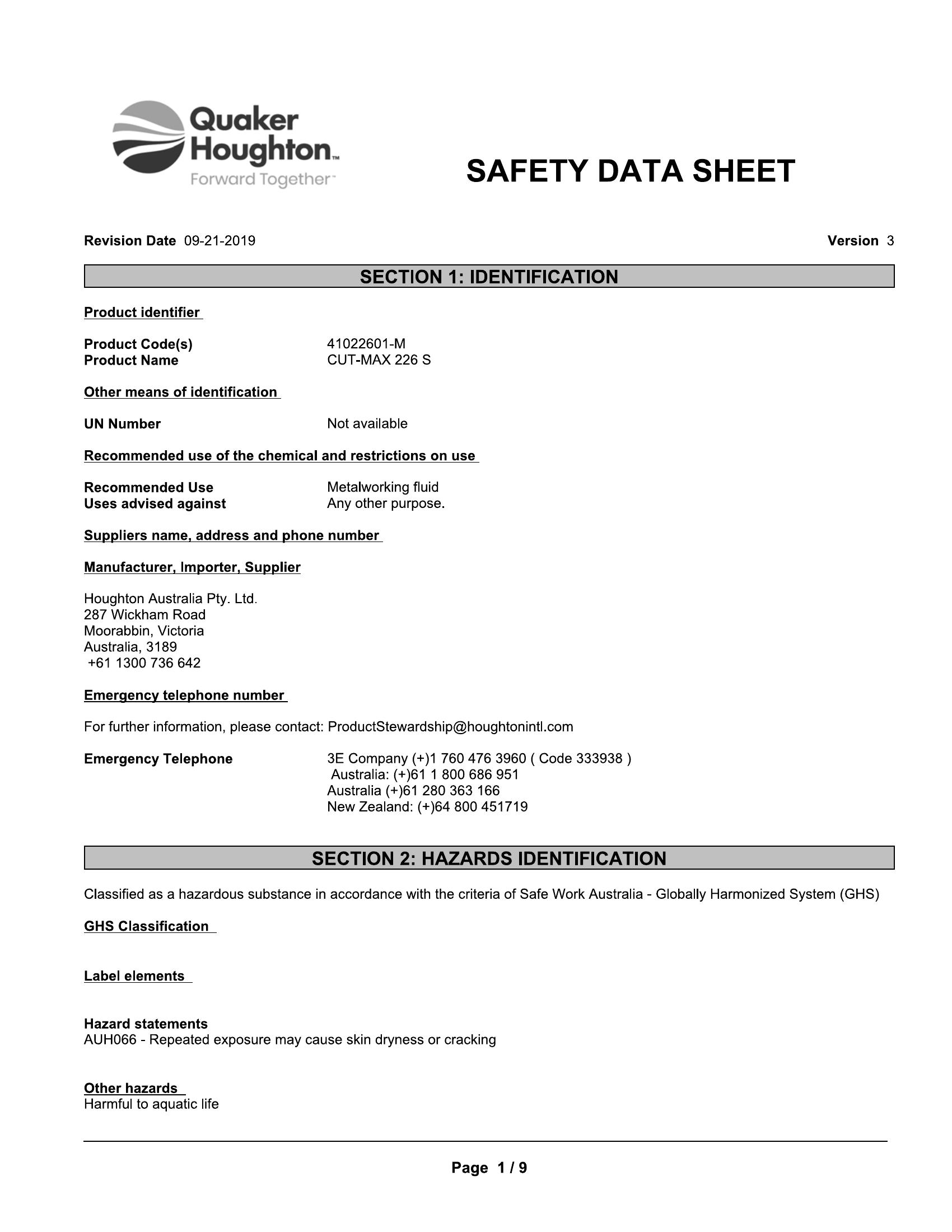 Quaker Houghton CUTMAX 226S 20lt pail