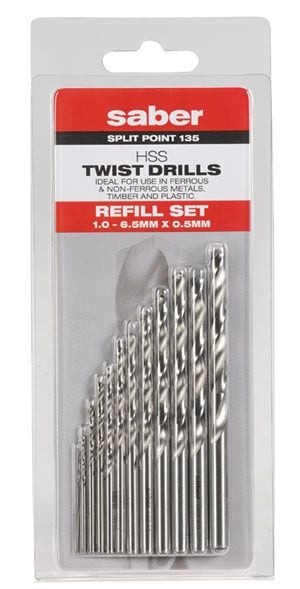 Saber HSS Bright Finish Drill Refill Set 1.0-6.5mm x 0.5mm increments. Ideal for replenishing Saber metric HSS Twist drill sets.