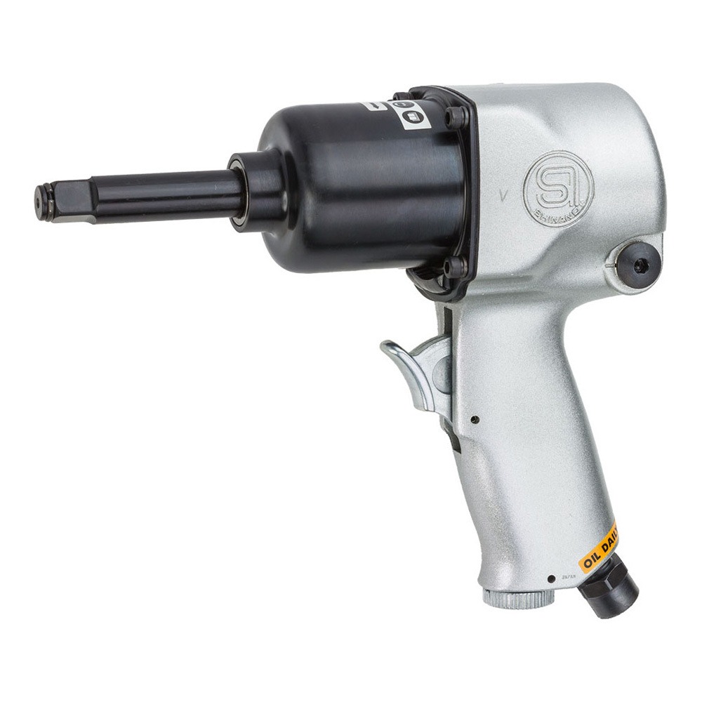 • Twin Hammer • 2″ extended anvil • • Higher powered impact wrench with 1/2″ Square anvil • • The twin hammer clutch delivers higher torque and faster power delivery • • Great for tyre shops Length: 225 mm Height: 201 mm Max Torque: 354 Ft/lbs (480 Nm) Working Torque Range: 0-266 Ft/lbs (0-360 Nm) Free Speed: 6,000 RPM Weight: 2.65 Kg Noise Level: 92 DBA (103 Pwr) Vibration A: 8.2 m/s2 K: 1.3 m/s2 Av Air Cons.: 4 CFM