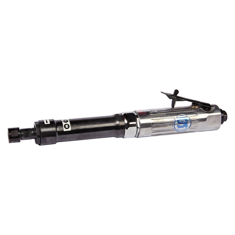 • Die grinder with the extended shaft • Designed for heavy duty and deep hole applications • Oversized motor for higher power • Lever throttle with safety lock • 1/8″, 3mm and 6mm collets available Length: 326 mm Height: 67 mm Collet/Spindle Size: 1/4’’ Free Speed: 24,000 RPM Weight: 1.34 Kg Noise Level: 89 DBA (100 Pwr) Vibration A: 4.1 m/s2 K: 0.9 m/s2 Av Air Cons.: 4.5 CFM Output: 537 Watts