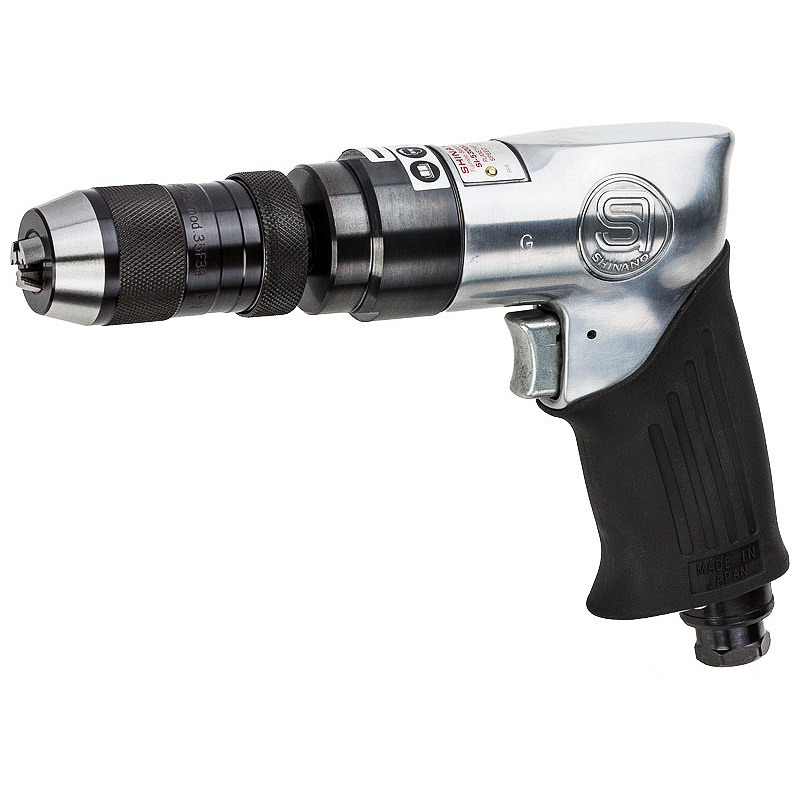 • Heavy duty 3/8″ air drill – 3/8″ Keyless chuck • Precise planetary gear mechanism supported by needle roller bearings • High power, durability and reduced vibration levels Length: 133 mm Height: 145 mm Chuck Size: 10 mm Drilling Cap: 10 mm Spindle Size: 3/8 x 24UNF Free Speed: 2,000 RPM Weight: 0.91 Kg Noise Level: 84 DBA (95 Pwr) Vibration A: 2.0 m/s2 K: 0.7 m/s2 Av Air Cons.: 3.6 CFM Output: 378 Watts