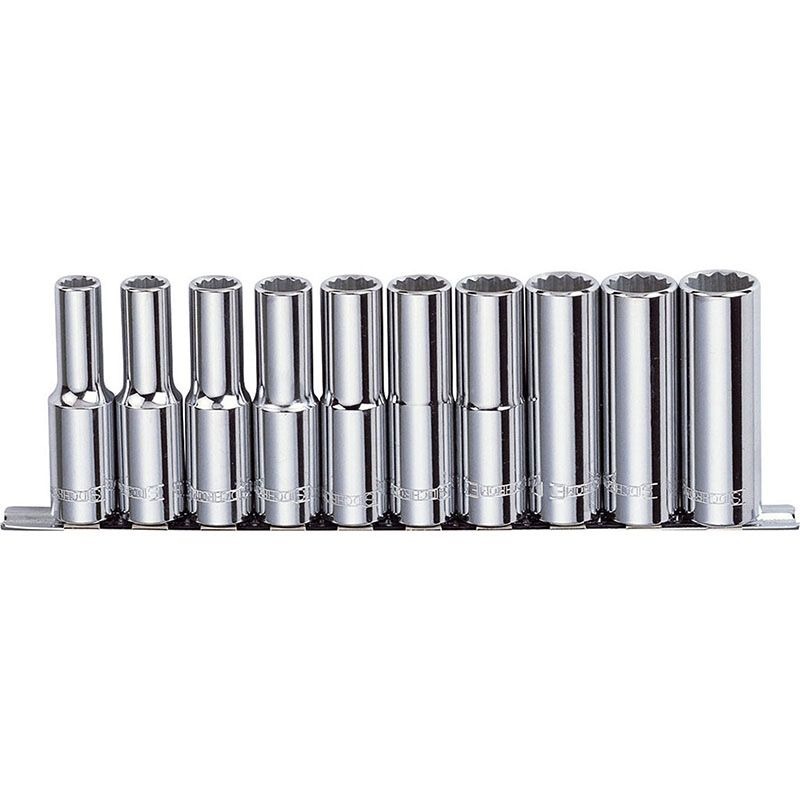 Contains: 10 metric sockets deep: 10, 11, 12, 13, 14, 15, 16, 17, 18, 19mm – clips & rail