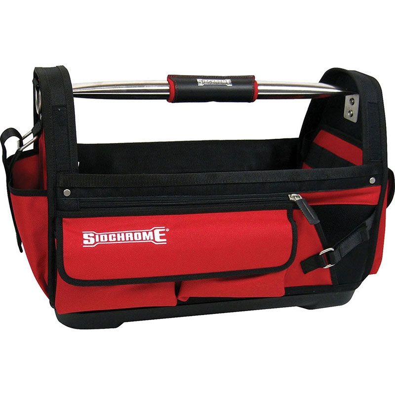 Closing flap, elastic tool retaining strap, screwdriver specific partition, large number of side pockets
