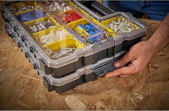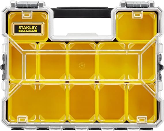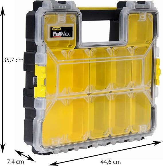 Stanley Fatmax 10 Shallow Compartment Organiser is ideal for small parts and accessories. Highly transparent, scratch and impact-resistant cover protects when you close all boxes, no slipping in the closed position. Robust, built-in handle-pleasant and wear in the filled condition.