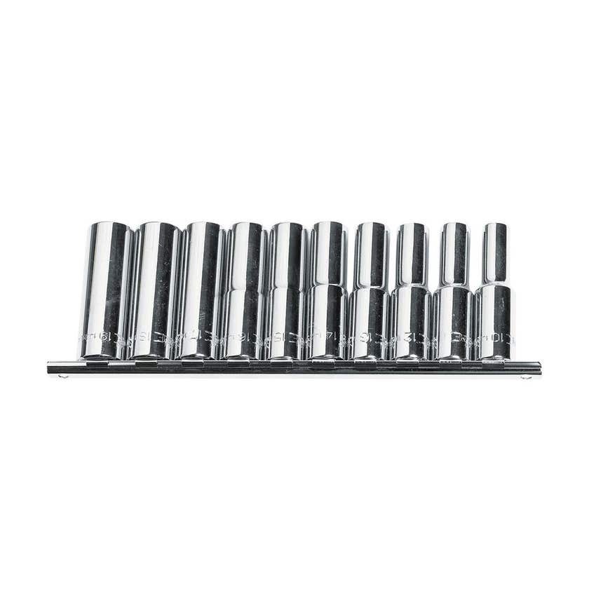 Includes 10 sockets ranging from 10mm to 19mm in size, all stored in a convenient carry case
