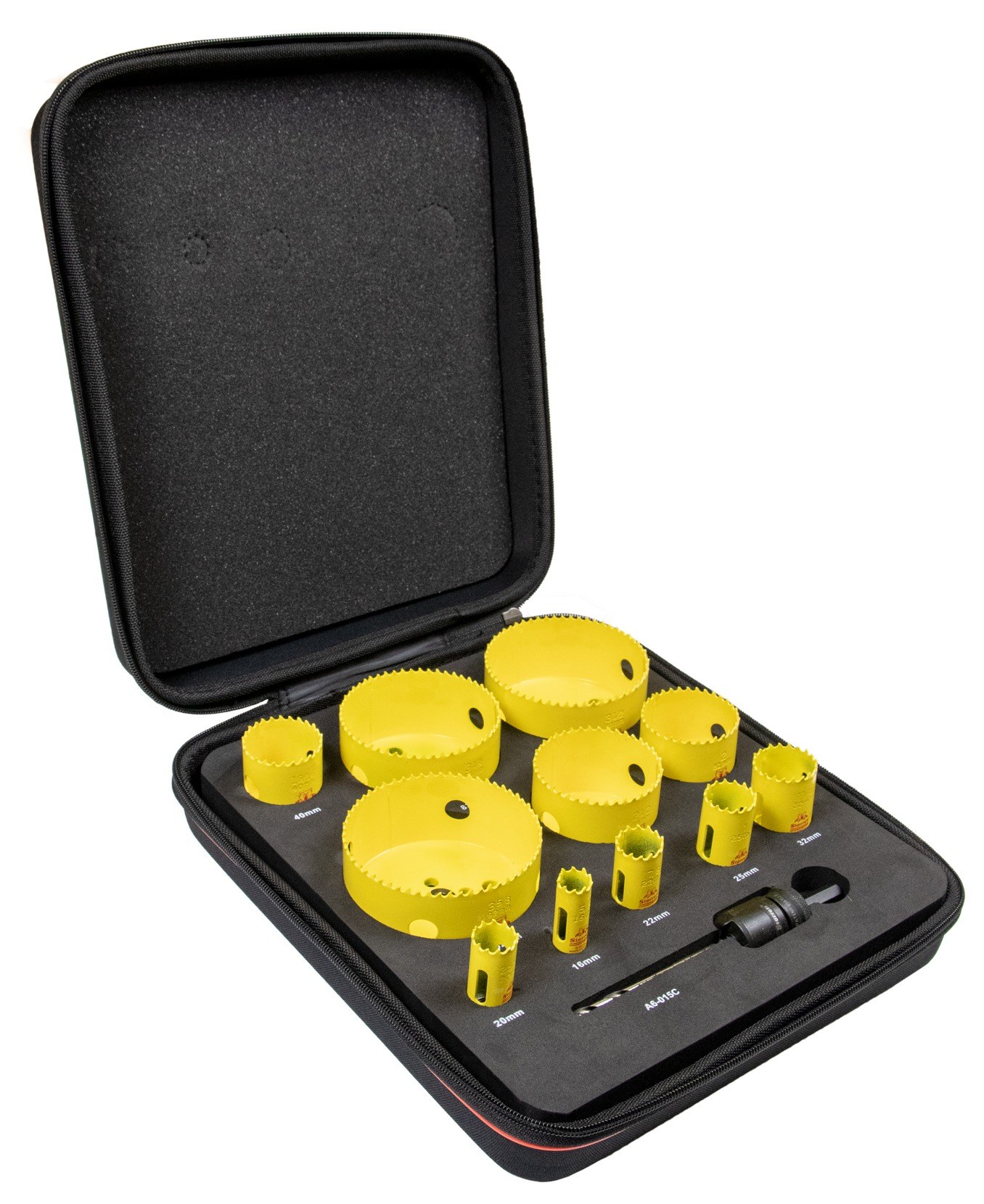 This Fast Cut hole saw kit contains the following saws: 16mm, 20mm, 22mm, 25mm, 29mm, 35mm, 44mm, 51mm, 64mm, 68mm and 76mm