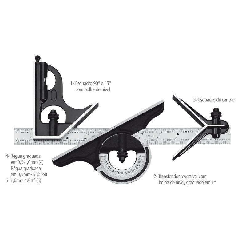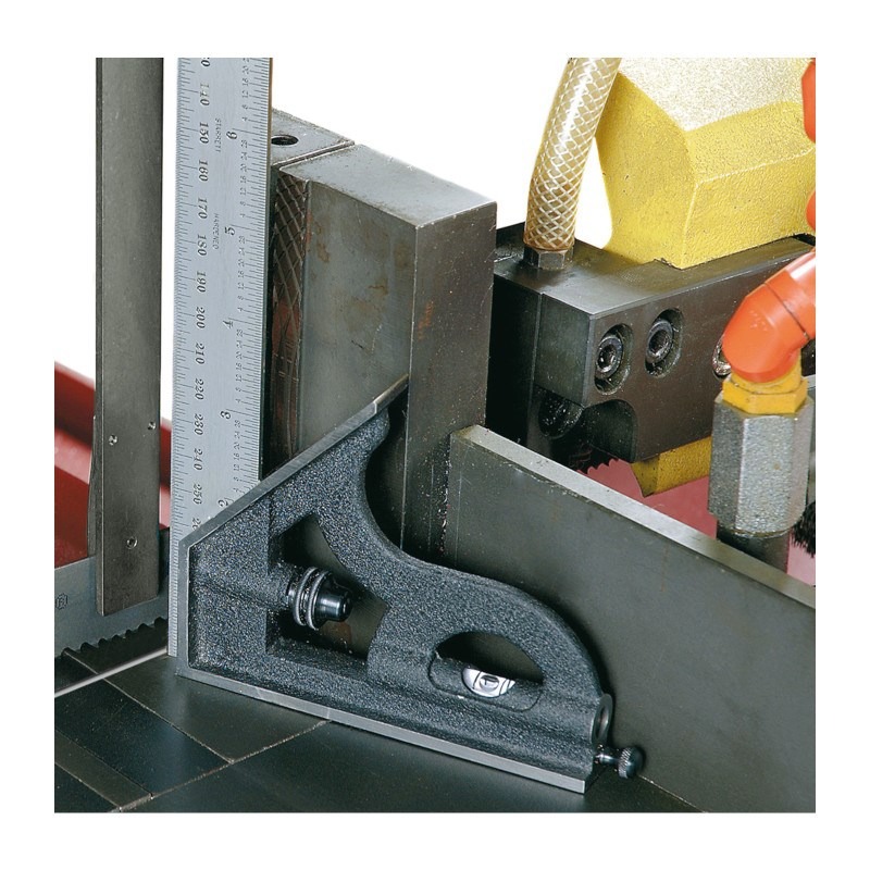 – It has a reversible fixing screw, scriber, bubble level on the normal square and protractor;