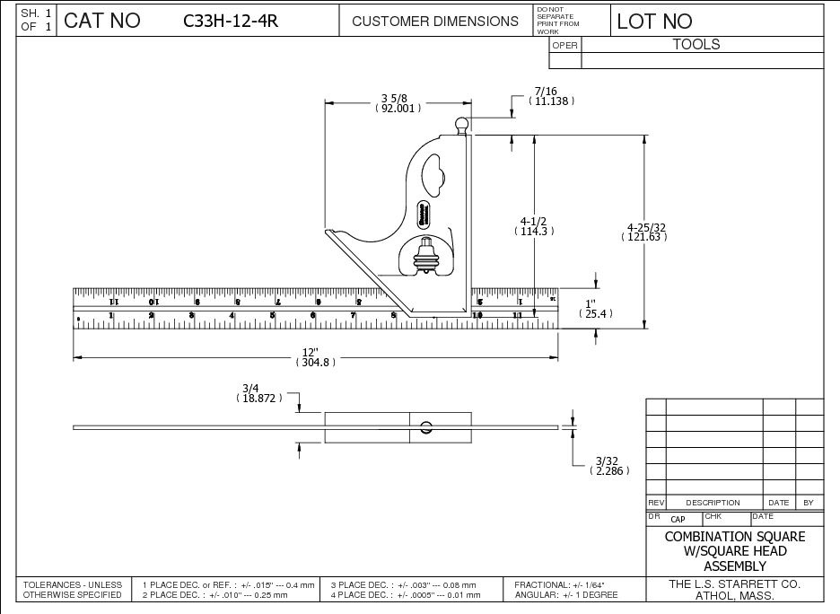 Starrett COMBINATION SQUARE W/SLC C33H-12-4RW/SLC Steel Combination Square, Inch, 12″
