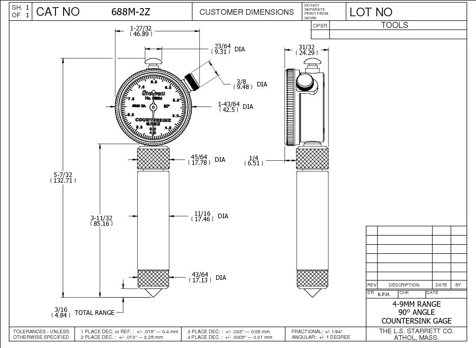 Metric Reading Dial Indicator Countersink Gage, 4-9″ Range, 0.05mm Grad, 90 Degree Angle