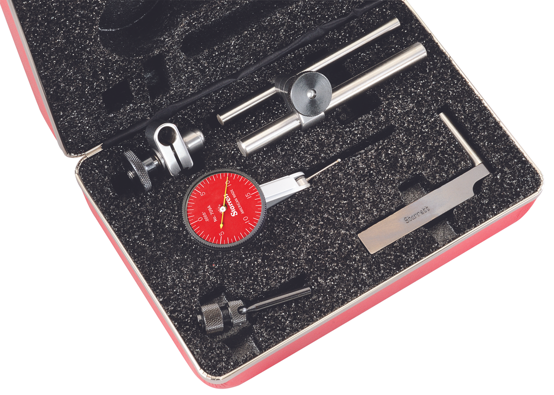 Dial Test Indicator with Dovetail, .030″ Range, 0-15-0 Dial Face, .0005″ Graduations, with Attachments, Case