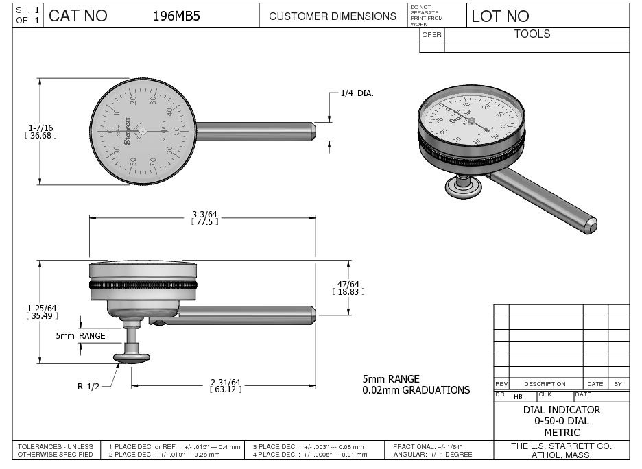 Back Plunger Dial Indicator, 5mm Range, 0-50-0 Dial Face, 0.02mm Graduations, 3 Contact Points and Adaptor