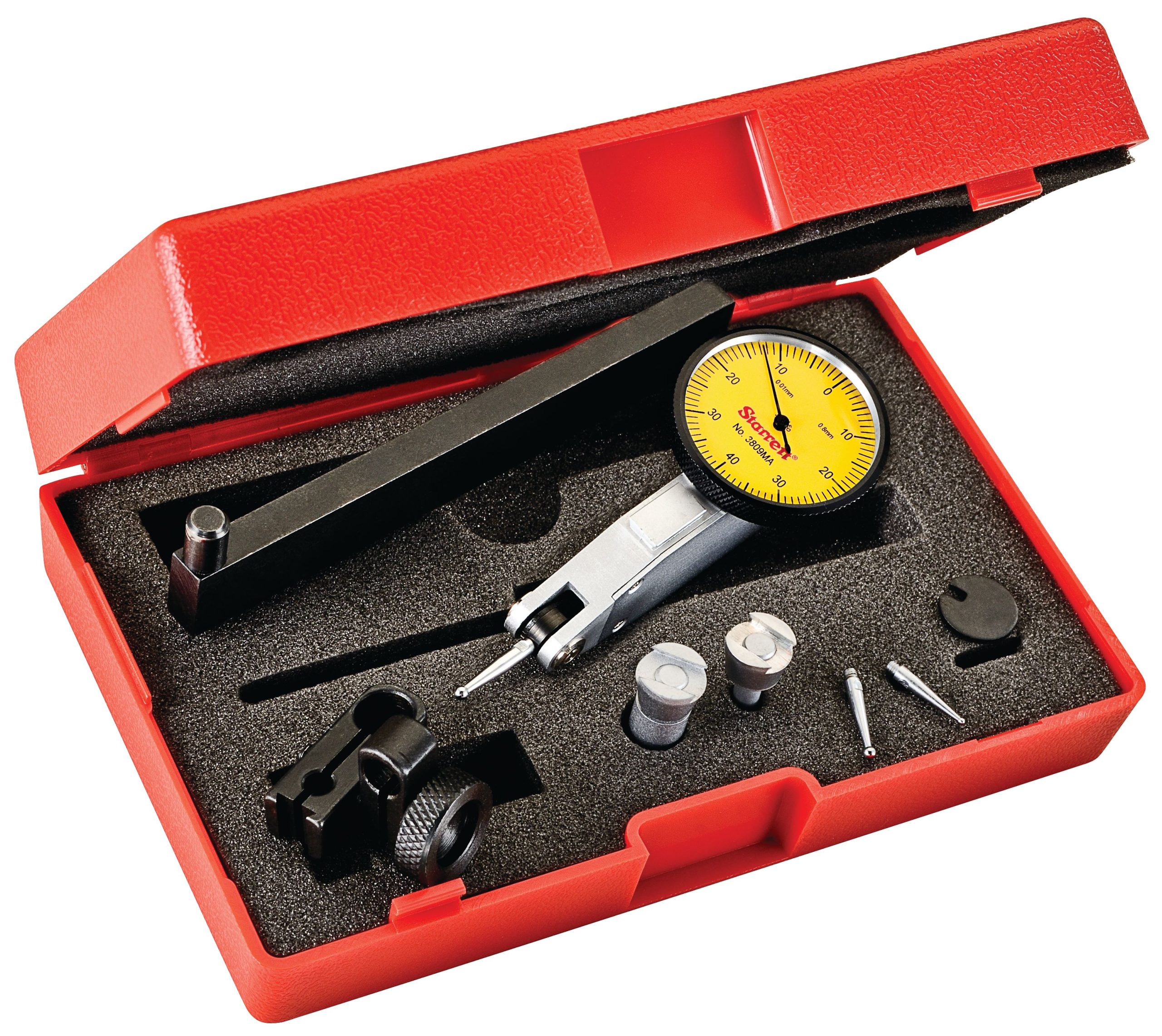 Dial Test Indicator with Dovetail, 0.8mm Range, 0-40-0 1-1/4″ Dial Face, 0.01mm Graduations, Two Dovetail Clamps, Case