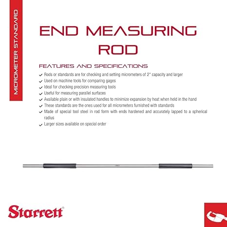 Measure with Precision – The Starrett End Measuring Rods or Standards are for checking and setting micrometers of 2″ capacity or larger and are also used on machine tools for comparing gages and checking precision measuring tools.