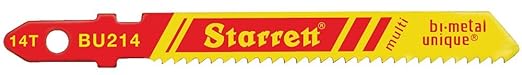 Starrett bi metal unique jig saw blades. Bi-metal unique – breakthrough technology provides stronger, longer lasting, faster cutting blades. This new technology joins two strips of high-speed steel wires to a backing steel in a solid phase, using the principle of solid-state diffusion bonding agent – totally different from traditional weld or laser bonding processes that rely on metal diffusion as the union agent at the interface. The proprietary (patent pending) solid-state diffusion process generates 170 percent more weld contact area compared to the existing bi-metal high-speed steels. The result is significantly reduced fracture and breakage at the HSS/backing material interface. Soon after initial use, the teeth develop a groove in the very thin center of backing material at the cutting edge. Multi-Edge Performance, as a result, the cutting stroke produces dual chips that are more easily removed from the cut. For applications utilizing coolant, more of it flows to the cutting surface. This is the Split-Chip Advantage. Lower cost per cut. Application material thickness: 5/32 to 1-inches. Teeth per inch: 14 TPI. Measures 2-inches cutting length by 5/16-inches width by 0.040-inches thickness. Set type: Wavy. Shank type: Unified. Regular tooth. Curve cut type.
