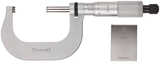 A choice of smooth friction thimble for uniform pressure or the combination ratchet and speeder for uniform pressure and quicker adjustment. Its balanced frame and thimble design insure easy handling and better readability and gracefully designed tapered frame is used in narrow slots and tight places. It has a ring-type knurled lock nut for quick and sure locking, extremely hard and stable one-piece spindle (the heart of our accuracy) and rigid one-piece frame of drop forged steel. Quick and easy adjustment, its gage block standard is furnished with micrometers.