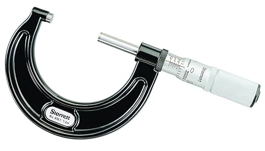 The Starrett 436.1 series outside micrometer has a vernier scale in inch units for taking precise outside diameter (OD) measurements, a tapered frame for measuring narrow slots and tight places, and a knurled friction thimble that helps provide quick adjustment capability. The micrometer’s steel frame has a baked enamel finish for protection and durability. The vernier scale on the thimble and sleeve is graduated to 0.0001” with a satin chrome rust- and glare-resistant finish. The spindle and anvil have flat, micro-lapped measuring faces for accuracy and are carbide-tipped for wear resistance. A knurled ring-type lock nut helps provide secure locking of the measurement position.