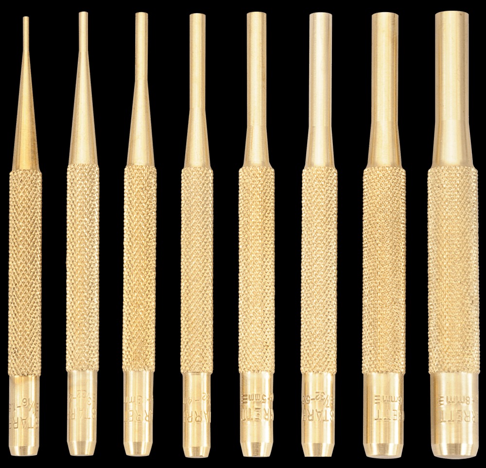 Drive pin punch is well proportioned, nicely finished, and has a knurled finger grip. Each punch has the size stamped on the head. The softer brass will not damage softer materials and delicate work surfaces. Available in eight individual sizes from 1/16” to 5/16” and as a full set of eight in an attractive pouch.