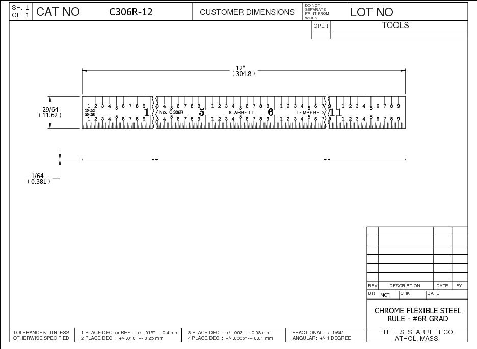 Full Flexible Steel Rule with Inch Graduations, 6R Style Graduations, 12″ Length, 1/2″ Width, 1/64″ Thickness