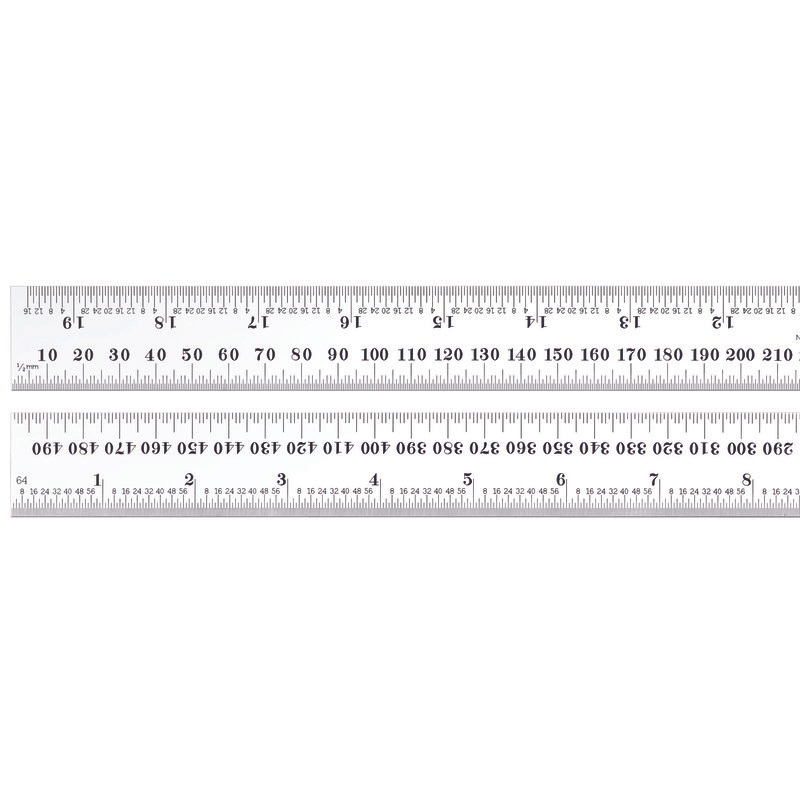 500mm – 19-1/2″ Spring-Tempered Steel Rule – Millimeter and Inch Graduations, Graduations at 32nds & 1/2mm on One Side; 64ths & mm on Reverse