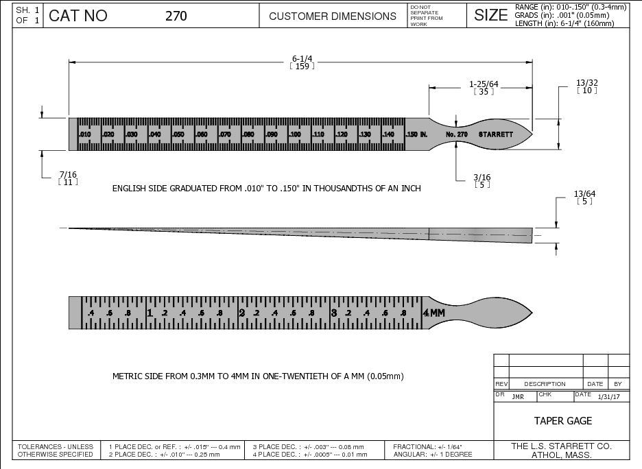 Taper Gage, .010-.150″/0.3-4mm Range, .001″/0.05mm Graduations, 6-1/4″/160mm Length