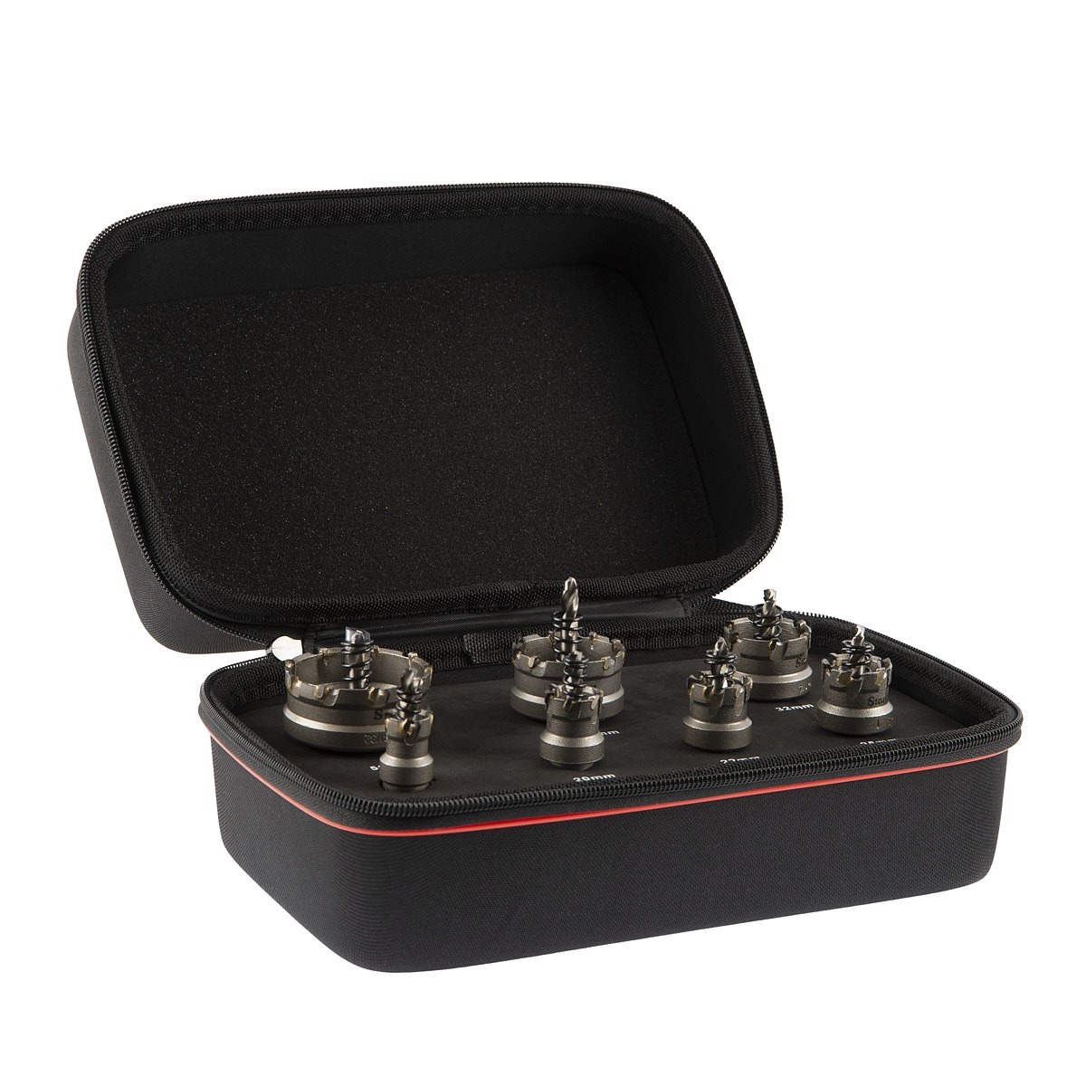 Teeth per Inch (25mm): 1 Cutting Depth: <3mm Box: EVA case for unbreakable protection Pieces in kit: 7 Colour: Grey Body Material: Steel Teeth Type: TCT Arbor Type: One piece Pilot Drill: SMD6 Core Ejector: Not required, spring pre-fitted