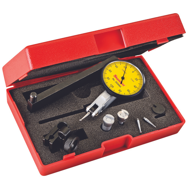 Dial Test Indicator with Dovetail, 0.2mm Range, 0-100-0 1-9/16″ Dial Face, 0.002mm Graduations, with Accessories, Case