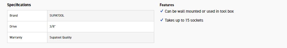 Home » Shop » HAND TOOLS » SOCKETS_SETS & ACCESSORIES » SUPATOOL 1011 SOCKET RAIL 3/8 DVE