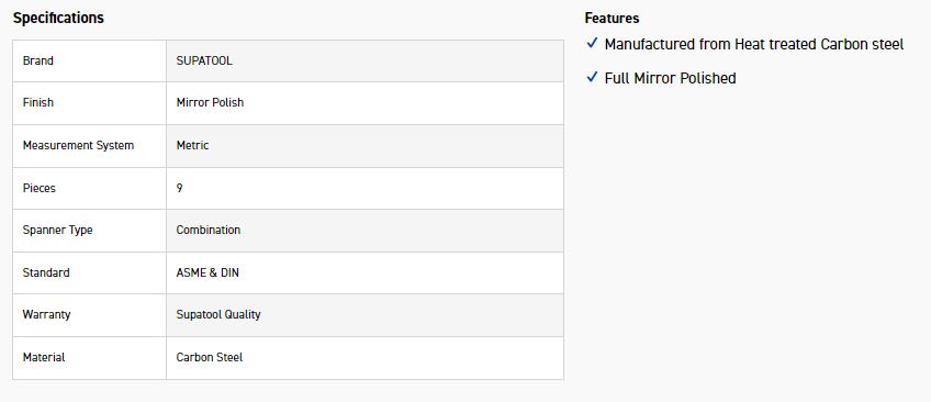 Home » Shop » HAND TOOLS » SPANNERS & SETS » SUPATOOL S3009 COMB SPANNER SET 9PC MET