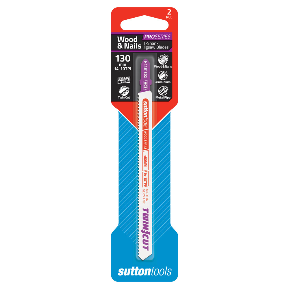 Home » Shop » HAND TOOLS » Sawblades - Jigsaw » Jigsaw Blade Euro Shank - Wood & Nails - Twin Cut, Long Life (<80mm) » JIGSAW T-SHNK H446 WD/NAIL TWIN CUT <80MM 130x14T HSSCo 2PC