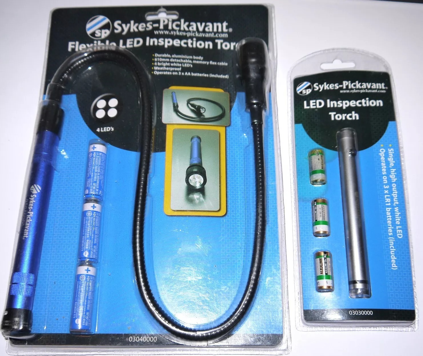 Durable and Aluminium Body. 610mm Detachable Memory Flex Cable. 4 Bright White LED’s. Weatherproof. Operates on 3 x AA Batteries which are included. Supplied in display packaging. Quality Assured Product from Sykes Pickavant