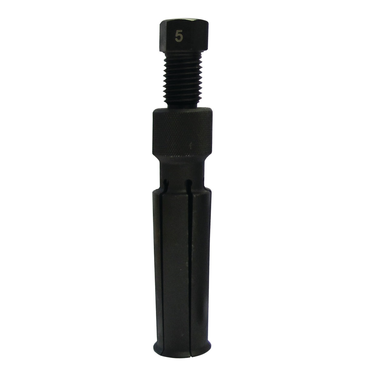The split collet is pushed into the centre of the bearing and then expanded via the hex nut on the end of the collet until a secure grip is achieved. The slide hammer is then attached providing the necessary extracting force.