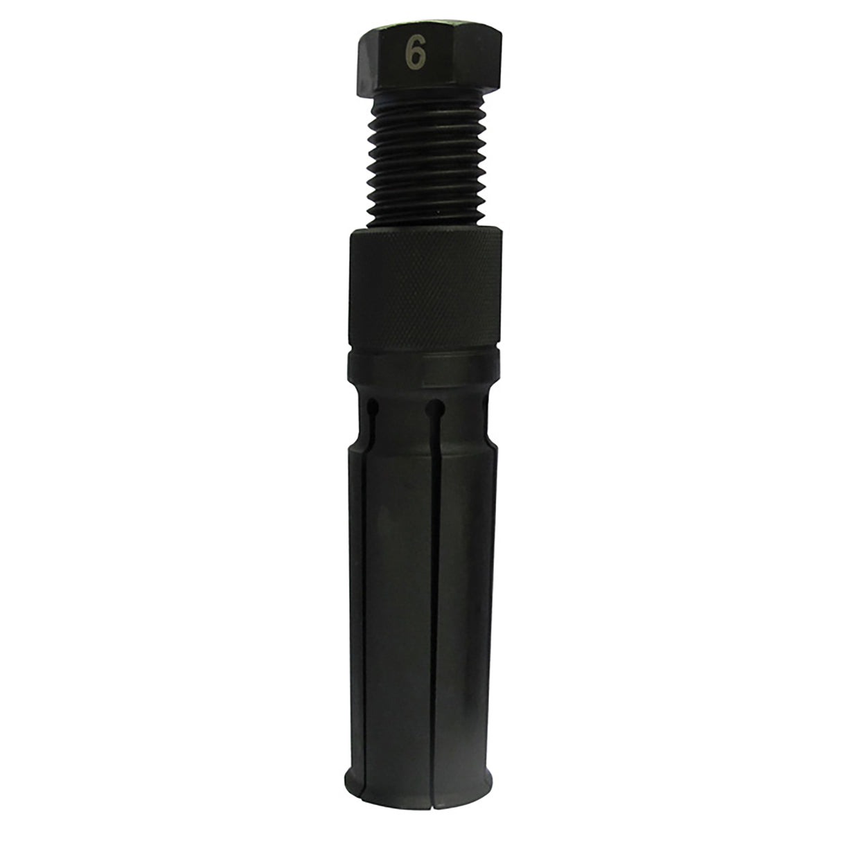The split collet is pushed into the centre of the bearing and then expanded via the hex nut on the end of the collet until a secure grip is achieved. The slide hammer is then attached providing the necessary extracting force.