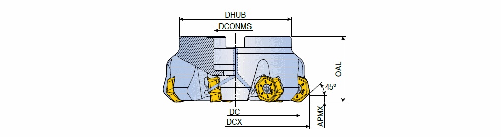 45° Face mills with reinforced 12 cutting edges inserts of high positive angle for general milling in max. depth of cut ap 5.0 mm