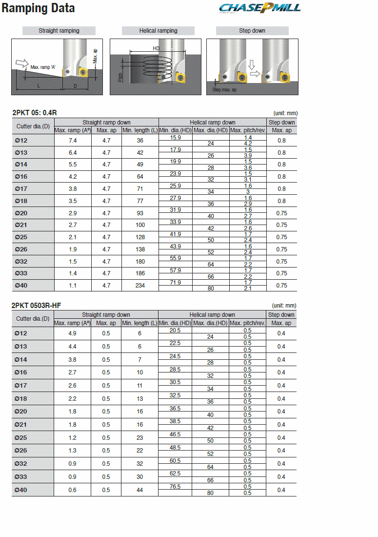 90° End mills with 2PKT inserts of high positive helical cutting edges