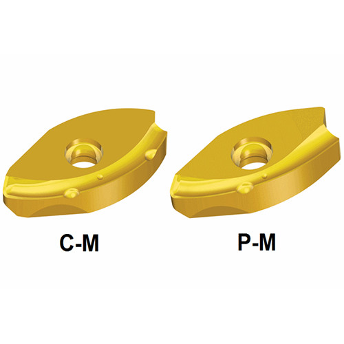Ball nose inserts with two helical cutting edges for three effective ball end mills for rough & semi-finish profiling in double-sided types of center (C-M) or periphery (P-M) sides