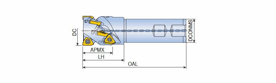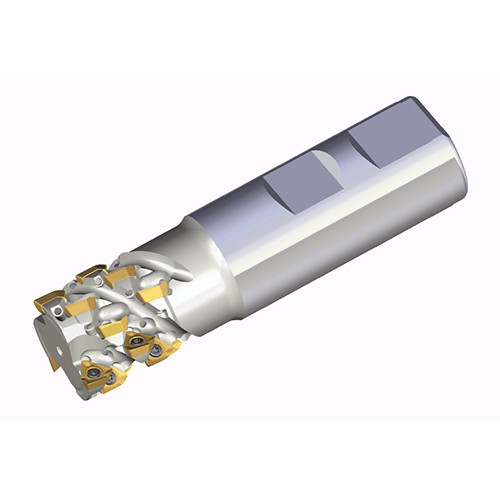 Extended flute end mills with 3PKT 06 inserts of positive 3 helical cutting edges