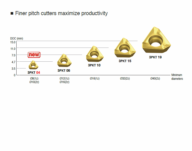 High positive inserts 3PKT with three helical cutting edges for 90° shoulders & general machining